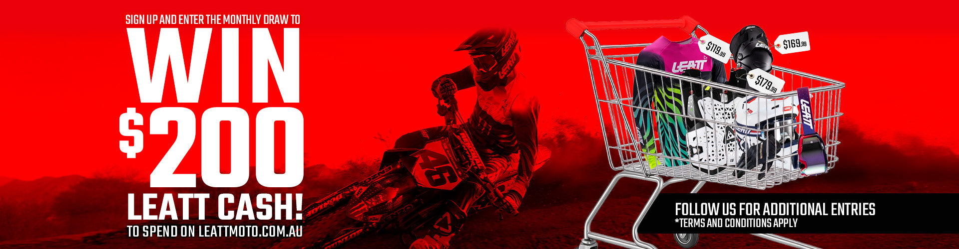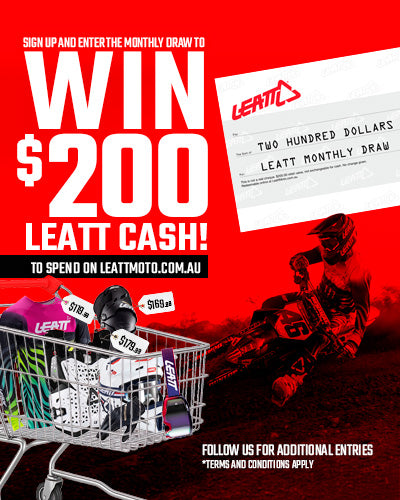 TERMS AND CONDITIONS: By subscribing to Leatt Moto Australia's emails you agree to receive marketing communications regarding Leatt products, events, and promotions. Signing up gets you into our monthly draw to win a $200 voucher to spend on this site. Follow our Leatt Moto AU Facebook and Instagram accounts for two additional entries. Winner is randomly drawn on the first Monday of every month. If public holidays occur on Monday winner will be drawn 1 day later. Winner will be contacted via email provided. Should the winner not respond within 5 days, 1 redraw will take place. Should the second drawn name not respond within 5 days on contact, that month’s draw will be null and void. The monthly winner must reside in Australia to be eligable for the giveaway. Leatt Australia reserves the right to end this promotion at any time.